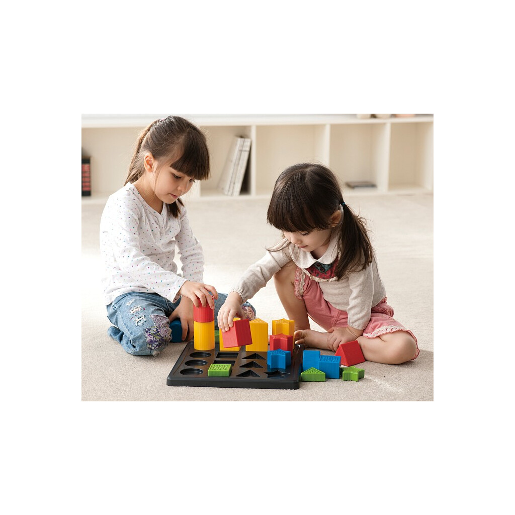 Trekant, firkant, cirkel og stjerne – hver i fire forskellige farver og højder – understøtter arbejdet med logiske rækkefølger og mønstergenkendelse. Mønstrene på klodserne og de klare farver stimulerer både den taktile og visuelle sans og styrker dermed barnets sansemæssige perception.