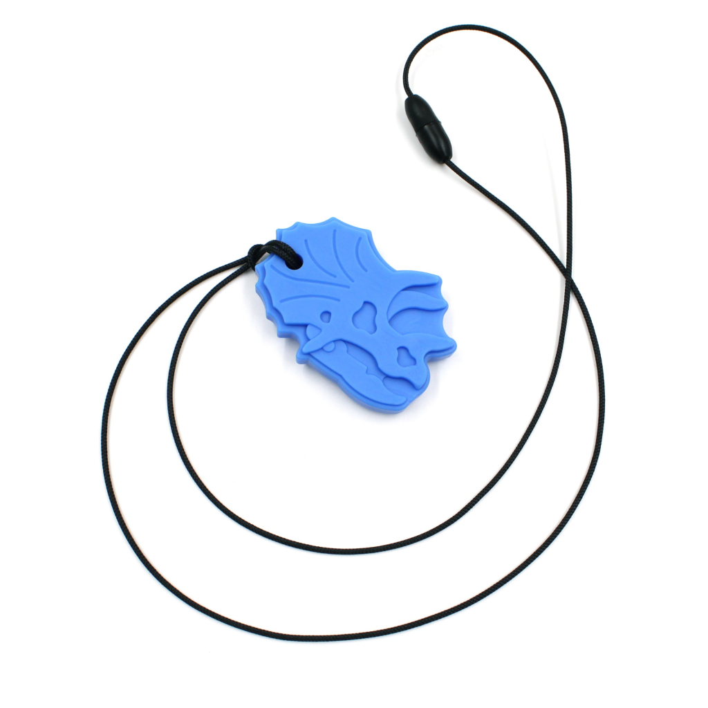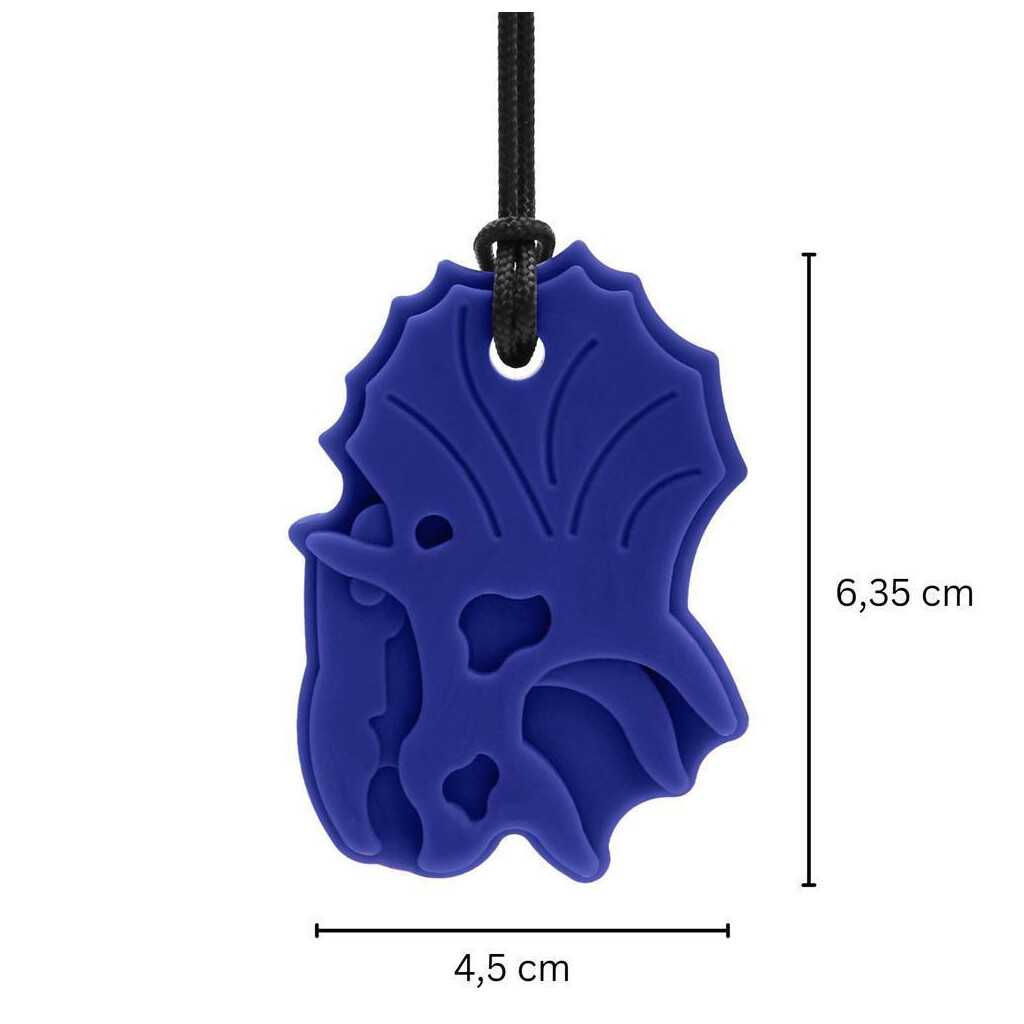 Direkte fra kridttiden er ARKs Triceratops tyggehalskæde et fossilt tyggehjælpemiddel, som dinosaurfans vil elske. Hvert vedhæng i form af et Triceratops-kranie måler cirka 6,35 cm i højden, 4,5 cm i bredden og lige under 1 cm i tykkelsen. Det er en fremragende mulighed for dem, der foretrækker at tygge med fortænderne eller kindtænderne. Brug denne orale sensoriske løsning som et sikkert alternativ til at tygge på kuglepenne, skjorter, fingre osv. og til beroligelse, koncentration og selvregulering.