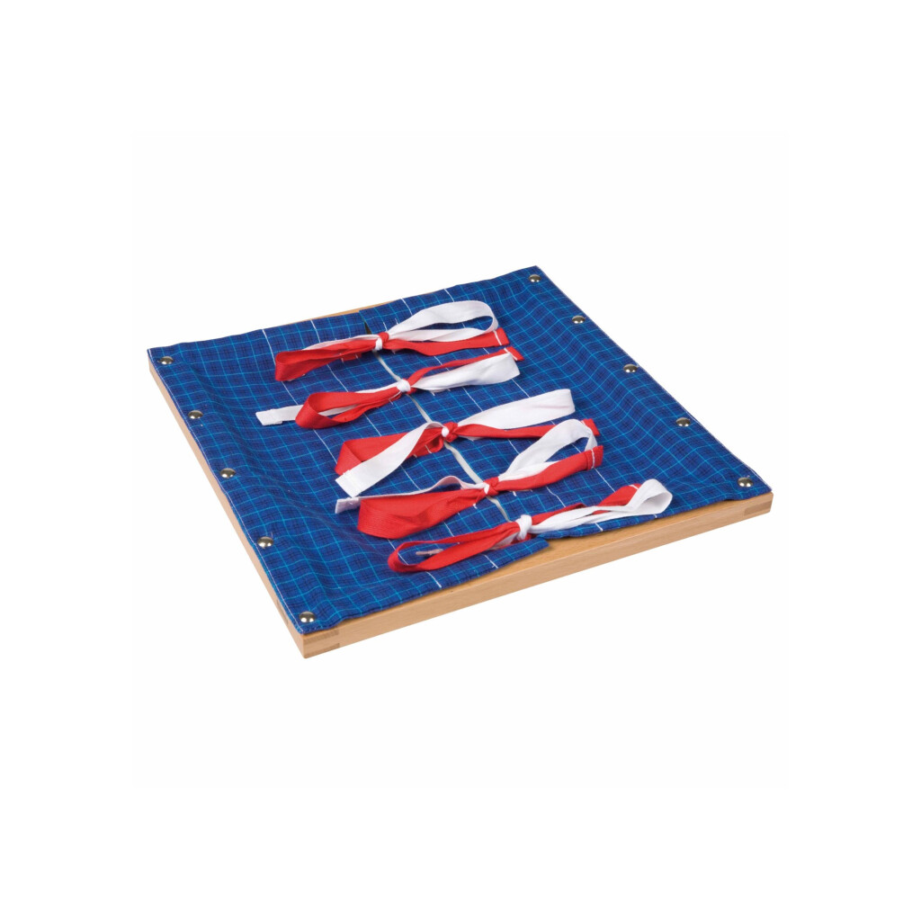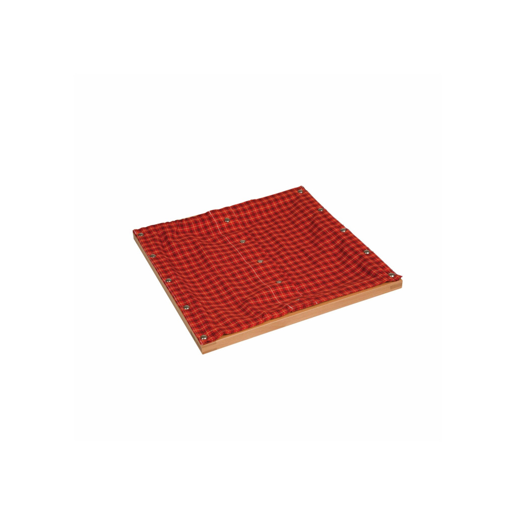 Denne ramme er en del af en serie rammer med låse, som hjælper barnet med at blive selvstændigt. Det kræver stor præcision at arbejde med den. Det er vigtigt at analysere forskellige handlingssekvenser i forbindelse med koordinering af bevægelser. Trærammen er beklædt med stof. Mål: 29,5 x 29,5 cm.